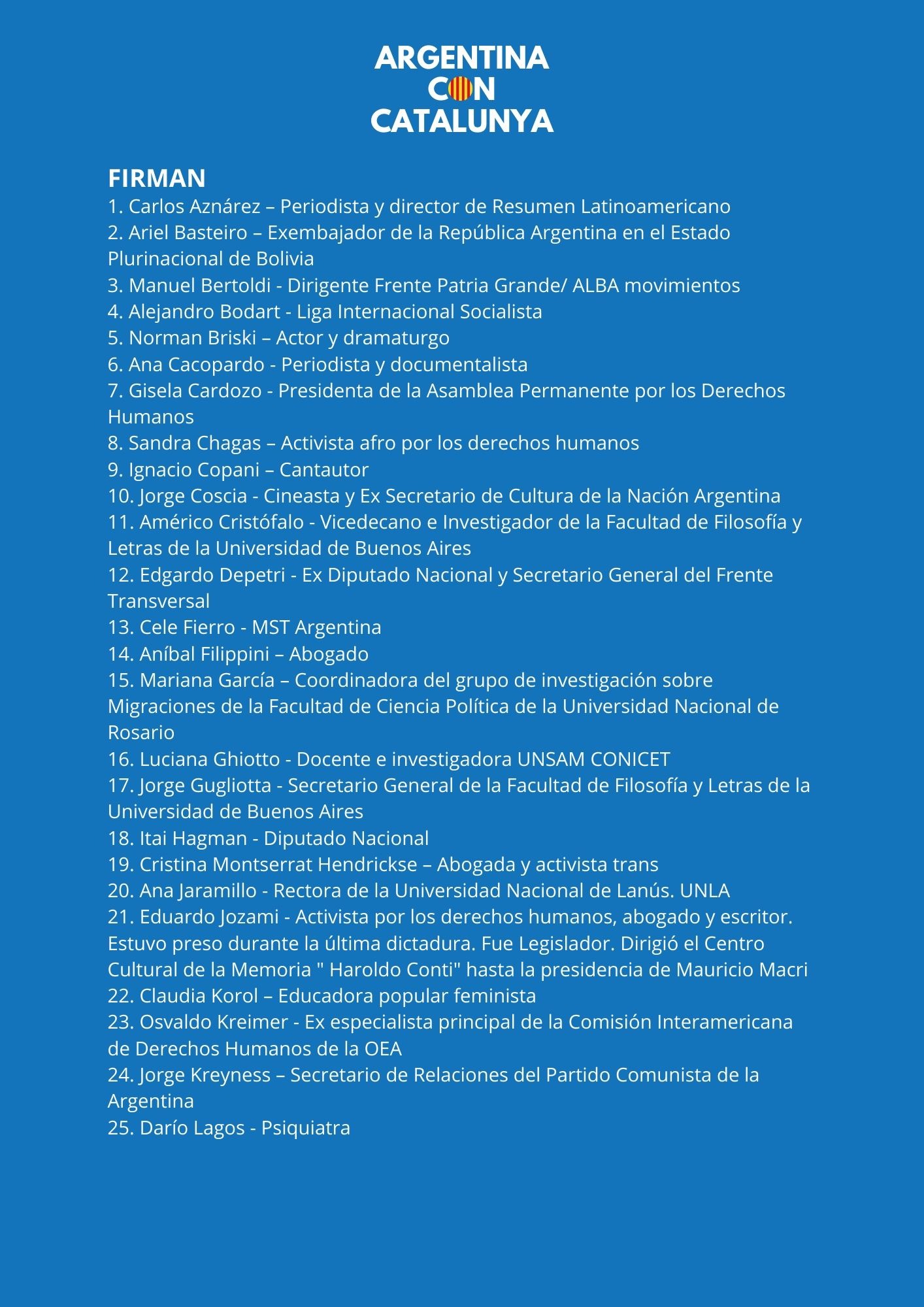 CATALUÑA: Referentes argentinos de los DDHH, la política y la cultura se solidarizan con los presos independentistas