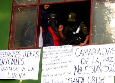 Leo con preocupación las noticias que llegan desde Bolivia. Ante la buena disposición del gobierno (que está sacando el Ejército a las calles) a atender las demandas salariales de los policás amotinados, ni un niño de teta puede creer que el motor del movimiento sea puramente reivindicativo. A mi me parece bastante claro que sus jefes buscan debilitar a Evo con un objetivo de mímima y otro de máxima. El de mínima es rajar a su jefe, Maldonado, y el de máxima, rajar también a su valedor, el ministro de Gobierno, Juan Ramón Quintana. Si alguién cree que estoy equivocado, que lo diga.