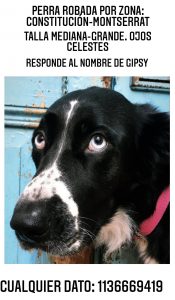 Hoy alrededor de las 14, a las puertas del supermercado chino de la la avenida Independencia al 1500, un hombre que se encontraba bebiendo algo, tirado en la vereda con la espalda contra la pared, con una llamativa gorra roja (ver video), se llevó a mi queridísima perra Gipsy, de 5 años, mestiza, de talla mediana tirando a grande, pelo negro azabache con mala cara, papada blanca y pecho blanco, cola rabona y llamativos ojos celestes claros. Se la llevó caminando hacia la Avenida Nueve de Julio, cruzó Independencia y siguió bajando en esa dirección por la calle Carlos Calvo.