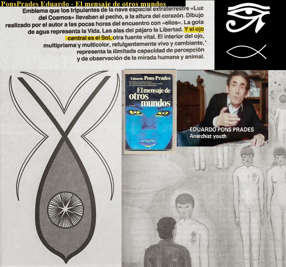 Pons Prades, curtido en mil batallas, estaba tranquilo. Y subió. Allí se encontró con siete extraterrestres con forma humana, «por lo menos, tenían un torso, una cabeza, dos brazos y dos piernas. Iban vestidos con una especie de mono blanco, muy ajustado al cuerpo, y calzados con unas botas —también blancas— que parecían ser de lona». Todos lucían «en el pecho, a la altura del corazón, un emblema en cuyo centro había un círculo, un ojo resplandeciente, multicolor y multiprisma, que no cesó de centellear un solo instante, y en el que, a menudo, quedaría clavada mi mirada».