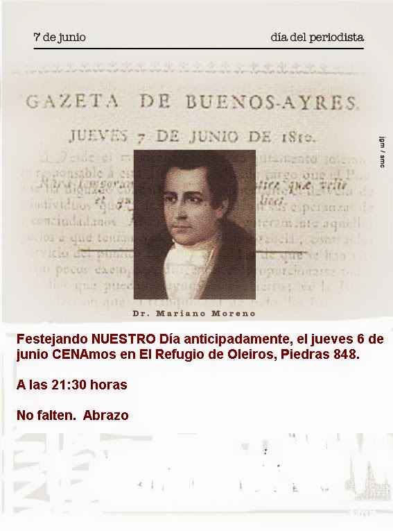 Hola. A fin de festejar el Día del Periodista, vuelven este jueves a las 21:30 las afamadas cenas antisoja. Como siempre en "El Refugio" (de los hijos del ayuntamiento de Oleiros), Piedras 844 -entre Estados Unidos e Independencia-, San Telmo N.O.