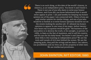 “¿Prensa independiente? No existe nada parecido en los Estados Unidos, salvo quizás en las aldeas… ¿Quién de nosotros sería tan audaz como para expresar sinceramente su opinión personal? Se me paga 150 dólares semanales para preservar a mi diario de la expresión de mi opinión personal.