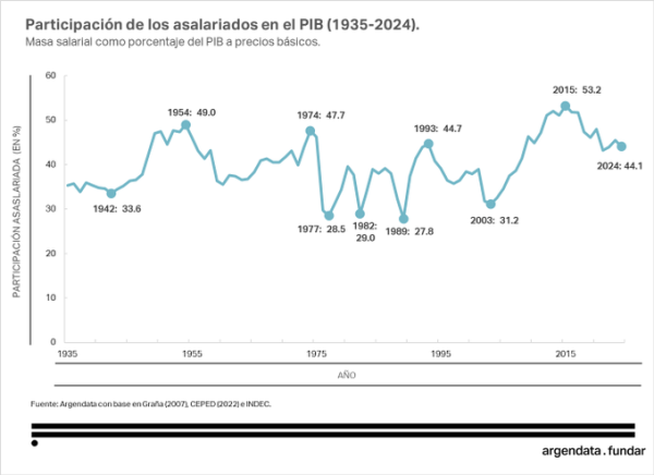 En sábado de RESURRECCIÓN les quiero compartir un cuadro que vi en redes sobre la PARTICIPACIÓN DE LOS ASALARIADOS EN EL PIB de nuestro país, en el período comprendido entre los años 1935 hasta 2024.