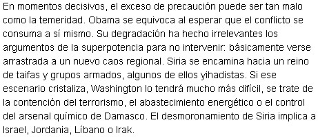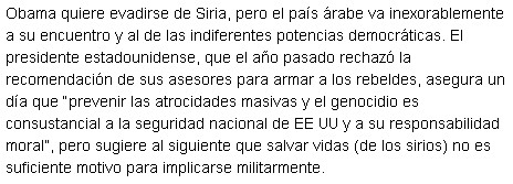 «Obama quiere evadirse.» Dios no lo permita. «El país árabe va inexorablemente a su encuentro».Para Javier Moreno, director de El País, supongo porque la editorial no la firma nadie, Siria corre hacia Occidente en busca de su amado EEUU para luego hacer una gira estelar para triunfar ante un auditorio difícil, las indiferentes potencias democráticas. ¿El País incluirá el Titanic España entre esas «potencias»?