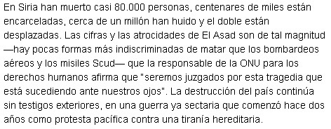 «En Siria han muerto casi 80.000 personas, centenares de miles están encarceladas, cerca de un millón han huido y el doble están desplazadas.» En Siria hay 20 millones de sirios a los que el ex Grupo Prisa, Liberty group, no les pregunta nada y pide que EEUU vuelque todos sus instrumentos de muerte y destrucción.