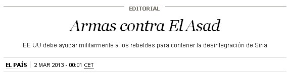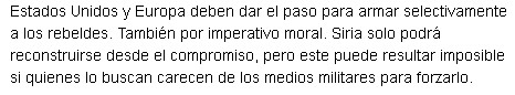 «Armar selectivamente a los rebeldes» ¿El ex grupo Prisa, hoy Liberty group, tiene idea de cómo se puede seleccionar a quiénes armar? Que lo cuente. Tal vez sepan a que batallón. Sería un milagro, porque han mandado tantas bandas armadas desde Libia, Kosovo y tantos otros lugares donde hubo conflictos bélicos recientes que el norte de Siria es una zona Mad Max. Cada batallón corre por el criminal que tenga de jefe, a sus ambiciones en medio del caos.