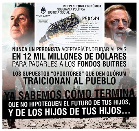 DEBE ACLARARSE QUE LOS ÚNICOS GOBIERNOS ¡PERONISTAS! QUE NO SE ENDEUDARON FUERON LOS GOBIERNOS DE PERÓN, HASTA EL 55; Y EL ÚLTIMO DE PERÓN-PERÓN HASTA 76; EL RESTO DE CUALQUIER SIGNO FUE SIEMPRE EL «PARTIDO DE LA DEUDA», ENTREGUISTAS Y OBEDIENTES A LOS DICTADOS DE LOS ORGANISMOS INTERNACIONALES DEL NUEVO ORDEN SINÁRQUICO. … PRUEBA DE ELLO ES LA ALIANZA DE LA PARTIDOCRACIA CORRUPTA DE LA LEGISLATURA ‘NATIVA’, DISPUESTA A ABOLIR NUESTRA LEGISLACIÓN SOBERANA, ORDENADO POR EL «ARREGLO» ESPURIO CON LOS FONDOS BUITRES, … PARA VOLVER A ENDEUDARNOS CON LOS «SALVADORES» MERCADOS INTERNACIONALES. … VERDADERAMENTE SE LA RECORDARA A NUESTRA ARGENTINA CON EL CONOCIDO EPITAFIO DE «VIVIÓ PAGANDO, … MURIÓ PAGANDO»