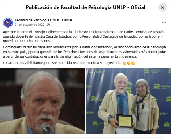 Este jueves la Legislatura de la Provincia de Buenos Aires declaró Personalidad Destacada de la Provincia de Buenos Aires a Juan Carlos Dominguez Lostaló.