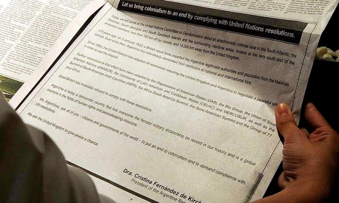 «Hace 179 años, el 3 de enero de 1833, una fuerza naval británica expulsaba a las autoridades legítimas argentinas y a la población de las islas Malvinas. Desde entonces, Argentina ha pedido sin descanso su restitución en foros nacionales e internacionales», continúa el texto, que también fue publicado en el periódico español El País y en el norteamericano The New York Times.
