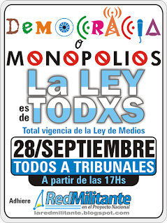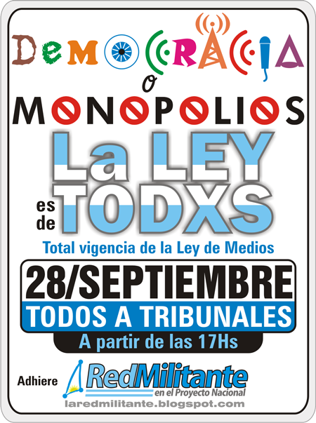 Por todo eso marchamos junto a los compañeros/as de Carta Abierta, de la Red Militante y a la Corriente por una Comunicación Nacional y Popular, e invitamos a participar de esta demostración que el pueblo argentino hará ante los Tribunales este martes 28/9 a las 17:00.