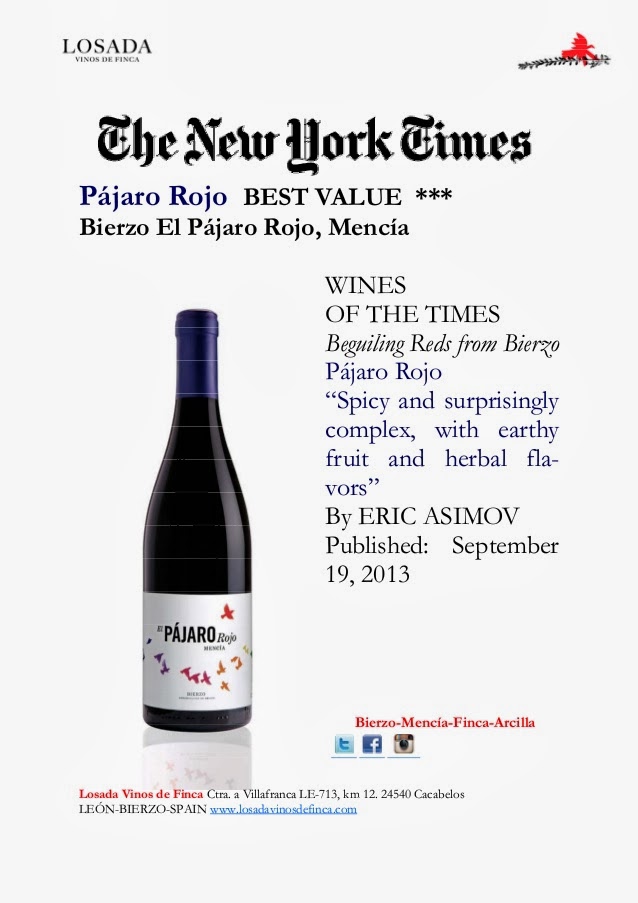 Esta mención se une también a la publicada el pasado mes de septiembre por el New York Times, donde el crítico Eric Asimov realizaba un repaso a los vinos del Bierzo, destacando El Pájaro Rojo por su increíble relación calidad precio. Precisamente, la nueva añada 2013 de este vino será presentada oficialmente el próximo sábado en la bodega de Pieros a una selección de distribuidores americanos encabezados por el importador de vinos españoles Steven Meztler.